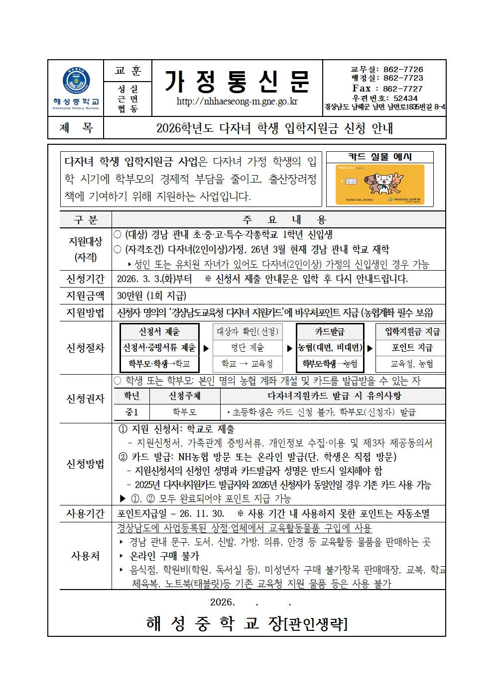 - 2026학년도 다자녀 학생 교육비 지원 신청 안내