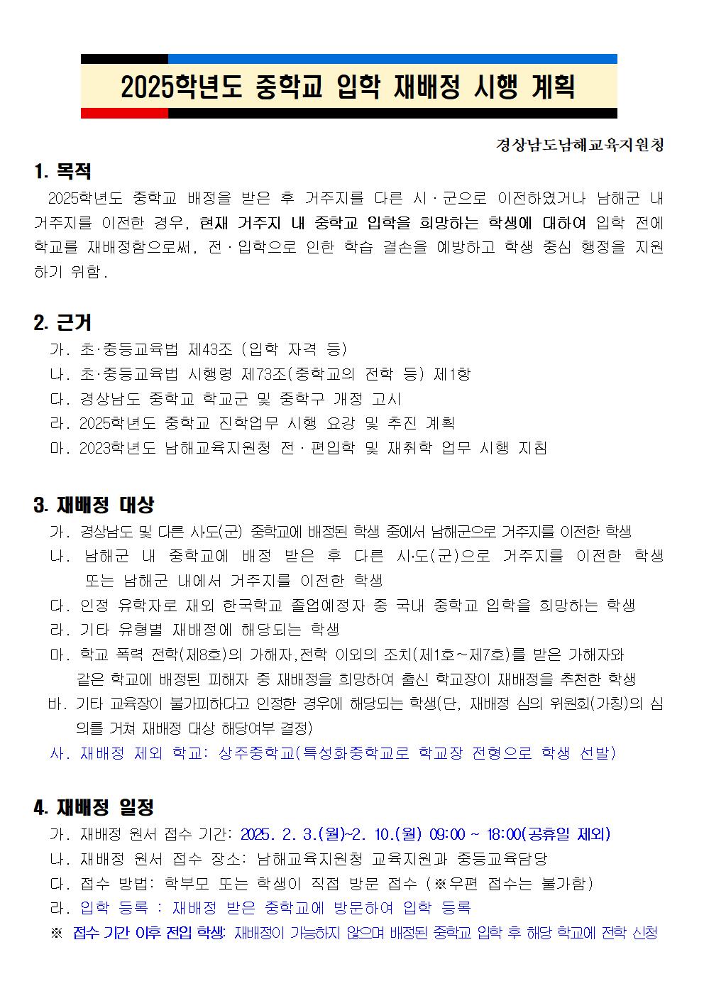 2025학년도 중학교 입학 재배정 시행 계획을 알려드립니다.