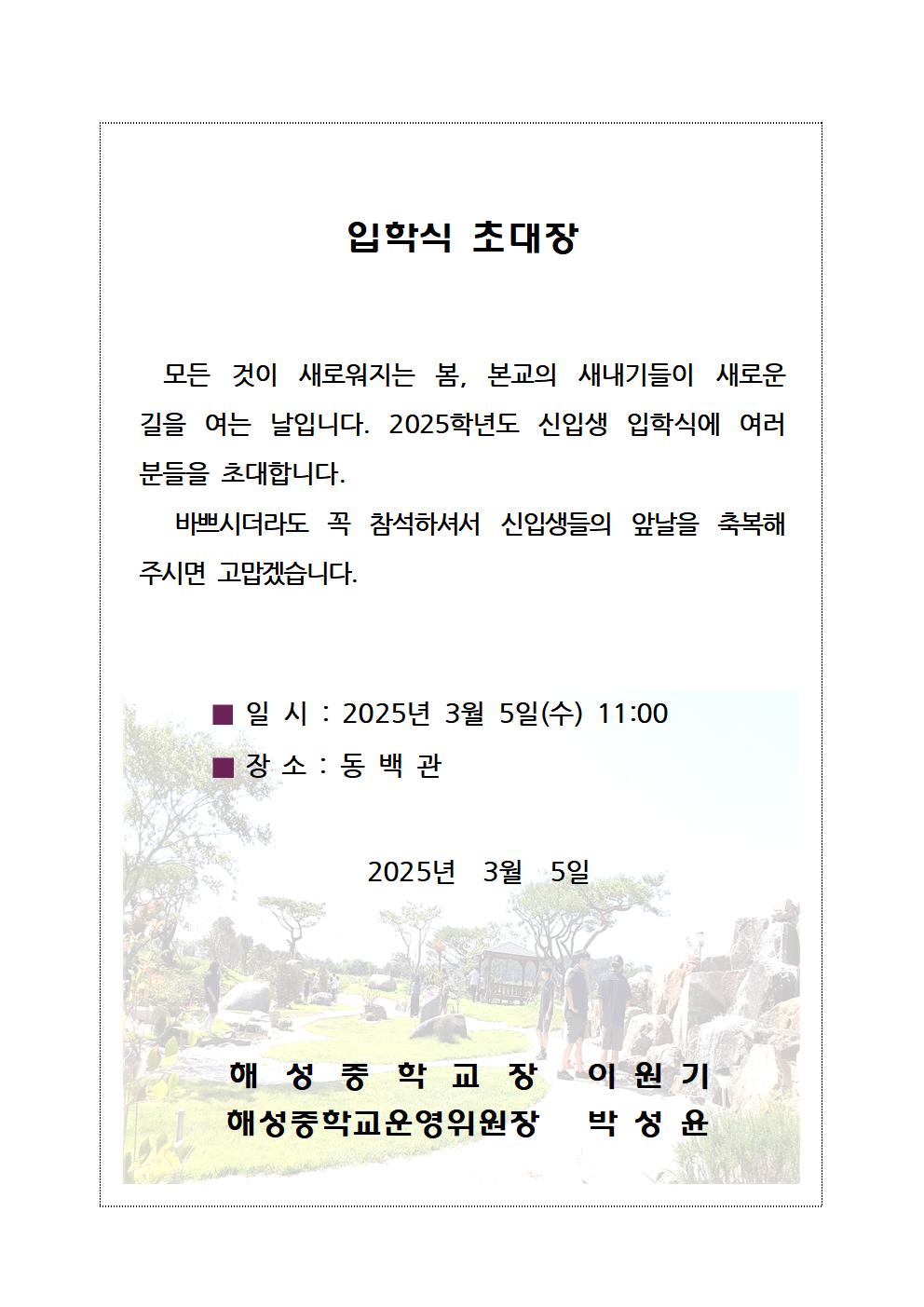 2025학년도 신입생 입학식에 여러분들을 초대합니다.