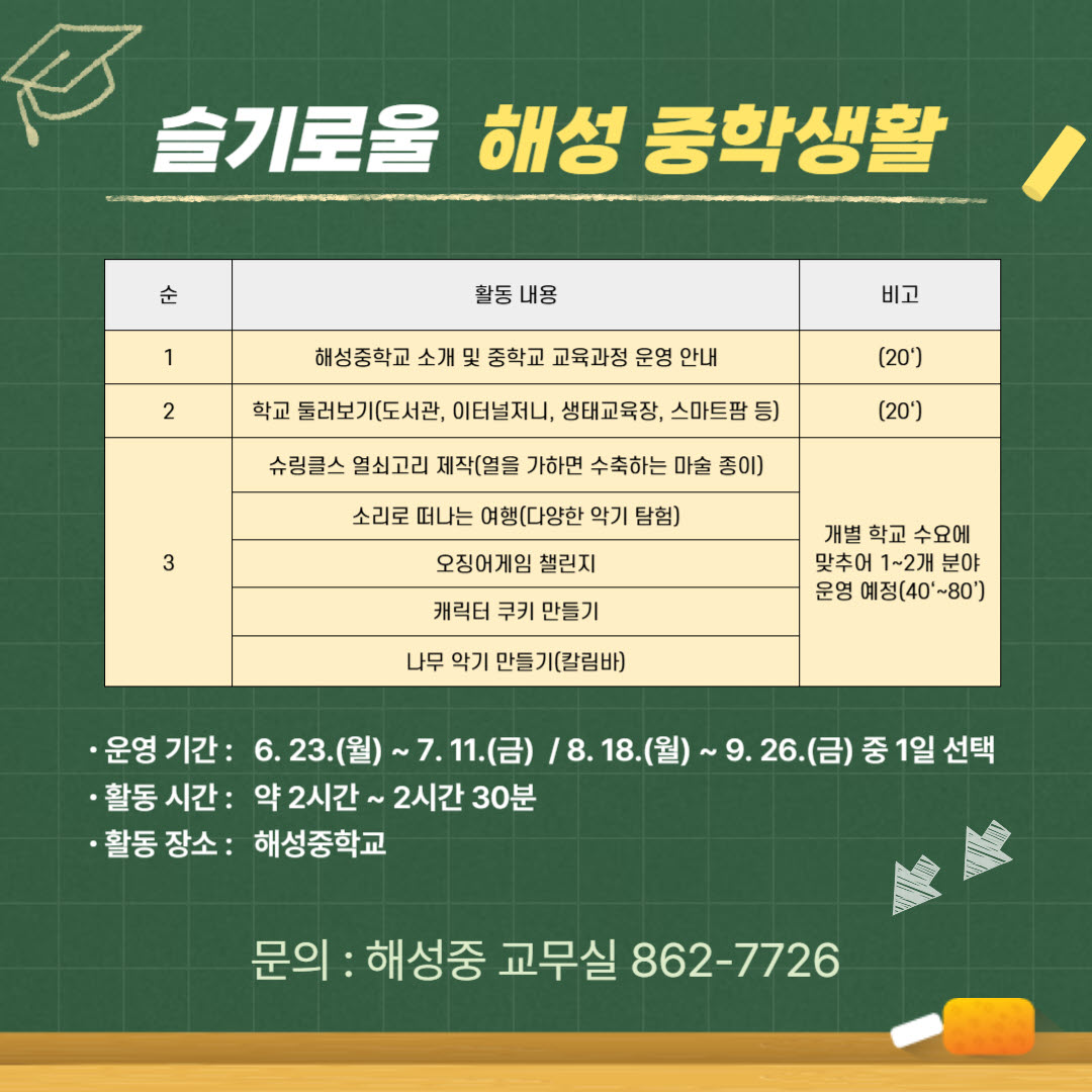 1. 운영기간: 2025. 6. 23.(월) ~ 7. 11.(금), 8. 18.(월) ~ 9. 26.(금) 중 1일 선택 2. 운영대상: 초등학교 5, 6학년 학생 3. 운영내용 - 중학교 교육과정 안내 및 학교 소개 - 슈링클스 열쇠고리 제작, 다양한 악기 탐험, 캐릭터 쿠키 만들기 등 4. 접수방법: 학교단위 단체 접수(문의: 해성중 교무부장, 862-7726)