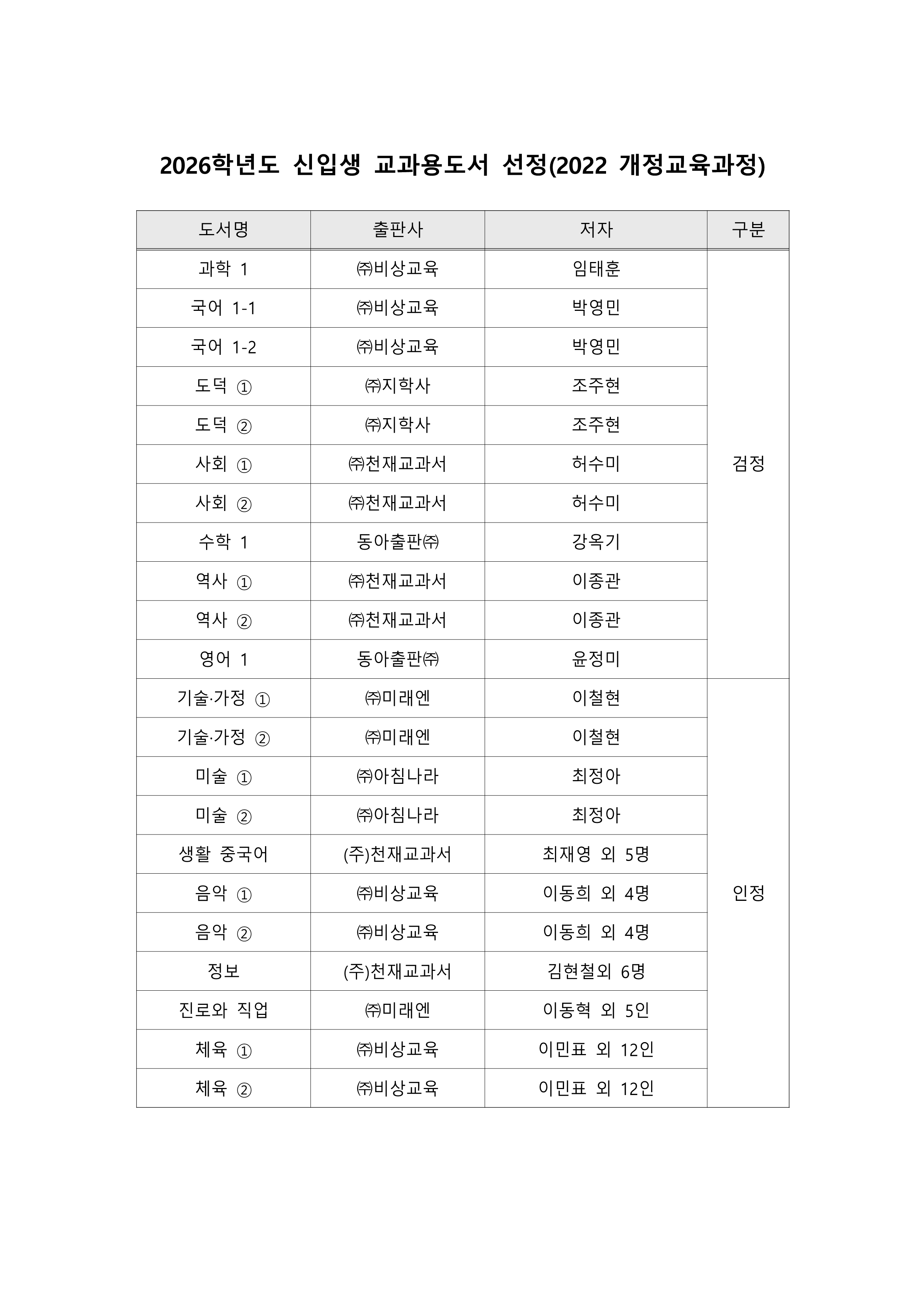 2026학년도 신입생 교과용도서 선정 결과를 아래와 같이 알려드립니다.(2022 개정교육과정 적용)